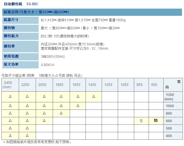 捆包帶卷軸置于機(jī)器外側(cè),輕輕觸摸即可完成捆包帶的替換操作方便。捆包帶的用量清楚可見(jiàn)。為方便操作,初次使用者容易操作,穿帶簡(jiǎn)單。請(qǐng)參考下列數(shù)據(jù)。